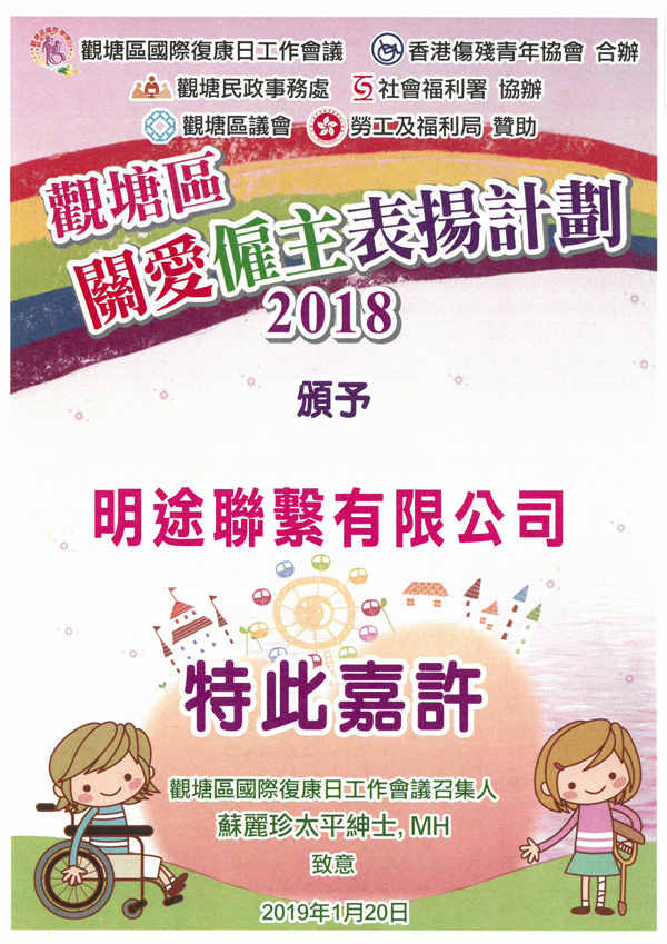由觀塘區國際復康日工作會議小組及香港傷殘青年協會合辦的「觀塘區關愛僱主表揚計劃2018」於2019年1月20日( 星期日)在秀茂坪商場露天廣場舉行。「明途聯繫」獲頒發嘉許狀,以表揚公司在傷健共融所作出的努力。高級經理(零售營銷)洪淑娟女士代表公司出席及接受獎項。