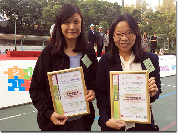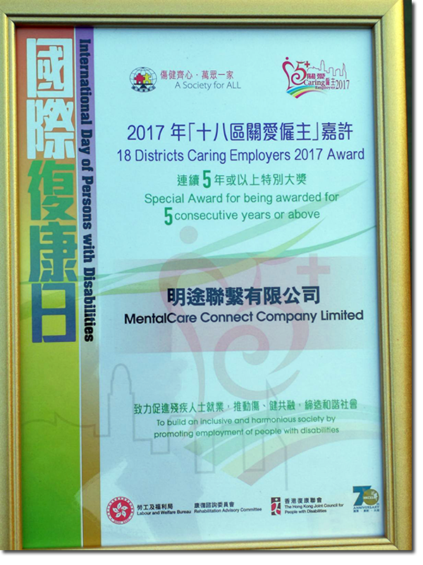 由香港復康聯會、香港社會服務聯會、勞工及福利局康復諮詢委員會合辦的「十八區關愛僱主」表揚計劃於12月3日(星期日)下午於葵芳興芳路遊樂園硬地足球場舉行。「明途聯繫」榮獲2017年「十八區關愛僱主-連續五年以上大獎」嘉許,以表揚和肯定公司在推廣傷健共融的努力。高級經理(企業營銷)吳秀雯女士代表公司領奬。