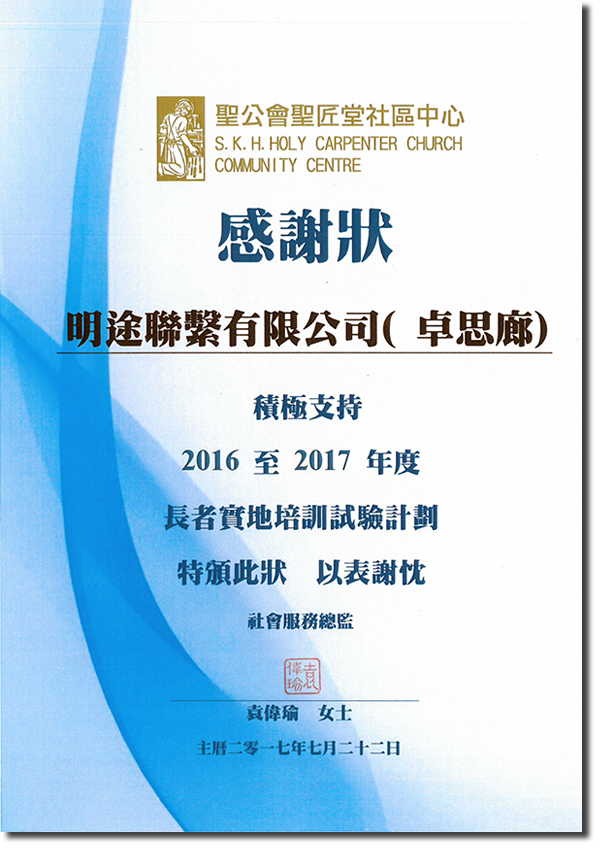 聖公會聖匠堂社會中心於7月22日(星期六)下午在聖公會聖匠中學禮堂舉行「銀齡創耆職」分享會並頒發感謝狀予參與長者實地培訓試驗計劃的社會企業。「明途聯繫」旗下的「卓思廊」積極支持並參與該計劃,為長者提供培訓及重新就業的機會,以達至「老有所為」及「成功老化」。業務經理陳彩嫻女士及卓思廊分店店長李玉英女士代表公司出席並接受感謝狀。