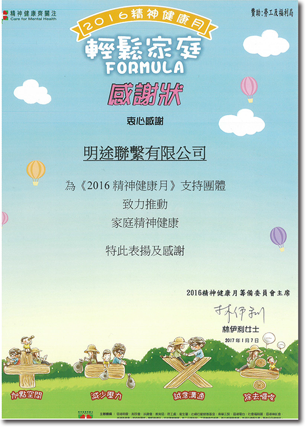 明途聯繫行政總裁鍾偉成於2017年1月7日出席由勞工及福利局及多個政府部門、公營機構和非政府機構合辦的「2016精神健康月」嘉許禮,並代表公司接受嘉許獎狀,以示共同宣揚及推動家庭精神健康的重要性。