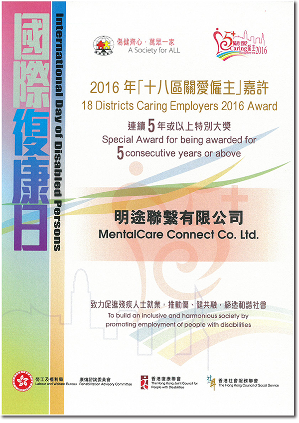 由香港復康聯會、香港社會服務聯會、勞工及福利局康復諮詢委員會合辦的「十八區關愛僱主」表揚計劃於十二月四日下午舉行。「明途聯繫」榮獲2016年「十八區關愛僱主-連續五年以上大獎」嘉許,以表揚公司在推廣傷健共融的努力。行政經理黃子卓先生代表公司領奬。