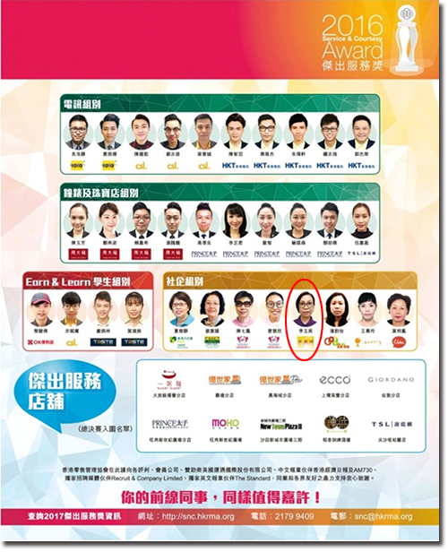 「卓思廊」員工李玉英女士成功晉身香港零售管理協會舉辦的「2016傑出服務獎」總決賽名單。感謝同事付出時間參與,而同事亦覺上了寶貴一課。