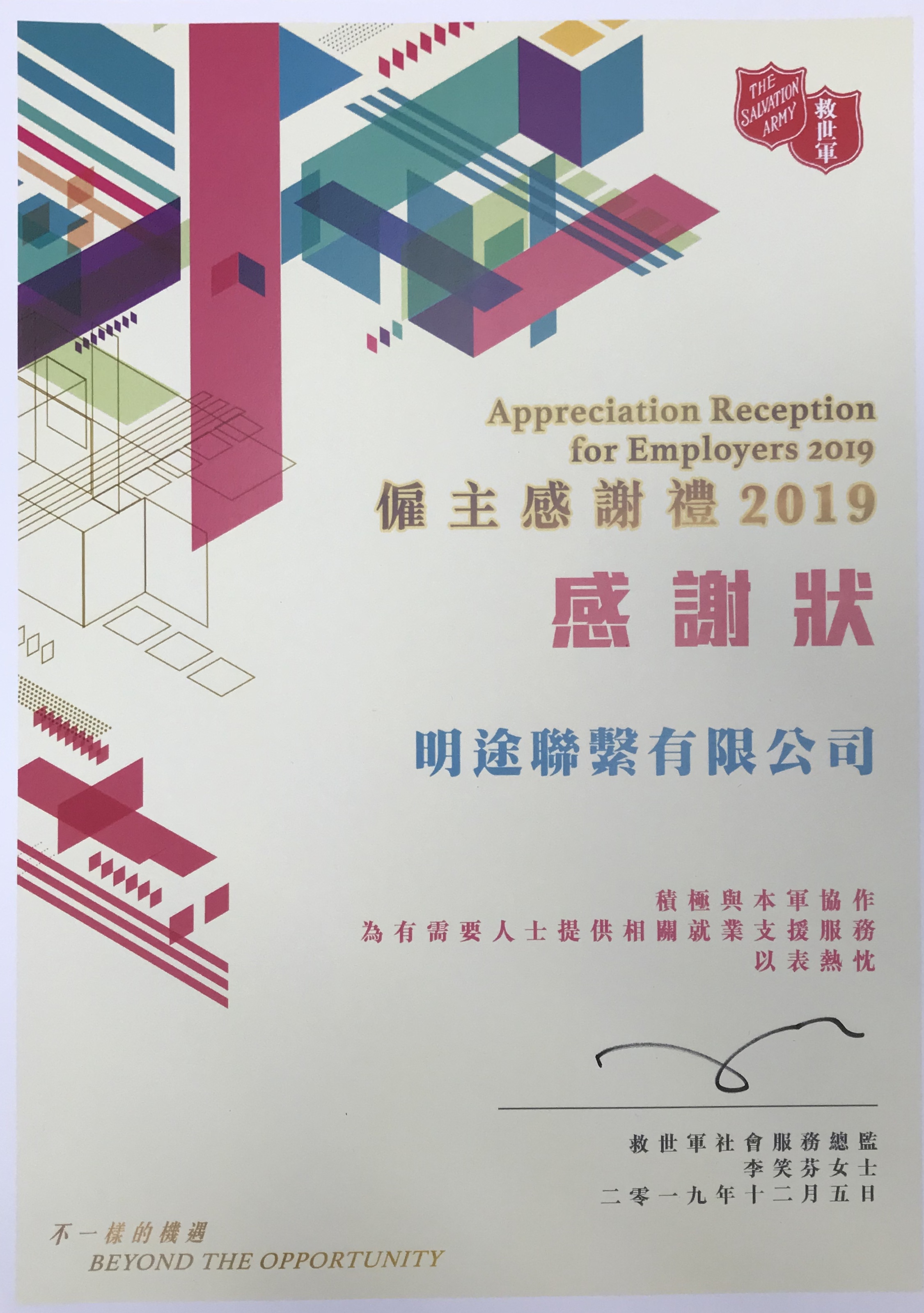 救世軍社會服務部於2019年12月5日假香港金域假日酒店舉行「僱主感謝禮2019暨協作交流」,以感謝社福機構支持不同年齡及有特殊需要的服務對象解決就業需要及困難。「明途聯繫」獲頒發感謝狀,以表揚提供就業及工作實習機會。業務經理陳彩嫻女士代表公司出席及接受獎項。