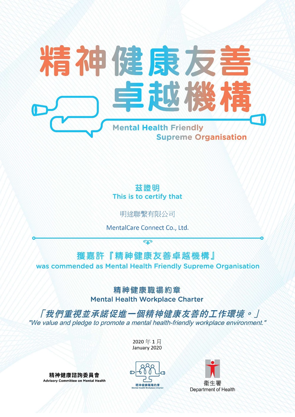 《精神健康職場約章》(《約章》) 是一個持續的精神健康推廣和公眾教育計劃,旨在增加公眾對精神健康的認識,長遠達致建立一個精神健康友善社會。「明途聯繫」於2019年12月獲嘉許為「精神健康友善卓越機構」。