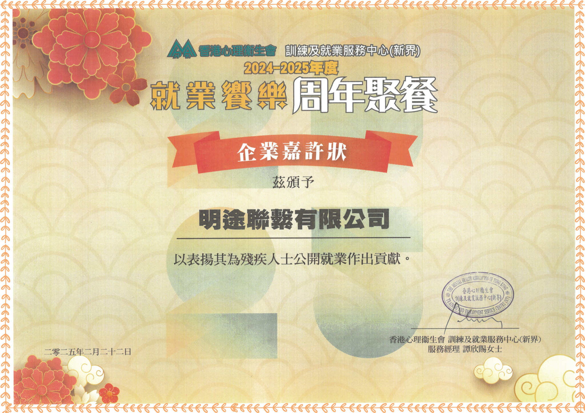 「明途聯繫」獲邀出席「香港心理衞生會」訓練及就業服務中心(新界)2024 – 2025年度就業饗樂周年敍餐。業務經理梁志豪先生代表公司出席,並獲頒予獎狀以表揚「明途聯繫」為殘疾人士公開就業作出貢獻。